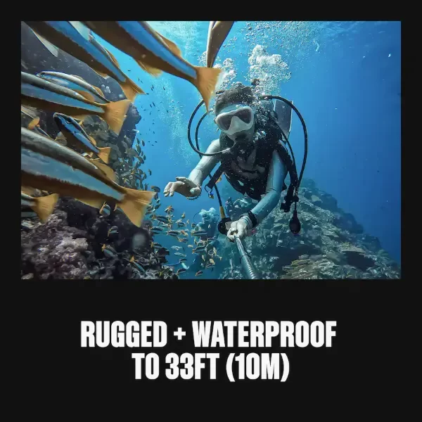 La cámara puede soportar profundidades de hasta 33' por sí sola. Integre accesorios de montaje adicionales en la configuración de su cámara con los dedos de montaje incorporados, rosca de 1/4"-20 y una interfaz magnética compatible con el Montaje de Cierre Magnético disponible por separado.